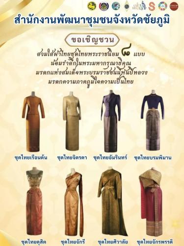 สำนักงานพัฒนาชุมชนจังหวัดชัยภูมิ ขอเชิญชวนร่วมสวมใส่ “ชุดไทยพระราชนิยม 8 แบบ” มรดกแห่งสมเด็จพระพันปีหลวง ผู้ทรงนำความเป็นไทยสู่สากล เพื่อสืบสานพระราชปณิธาน สมเด็จพระนางเจ้าสิริกิติ์ พระบรมราชินีนาถ พระบรมราชชนนีพันปีหลวง