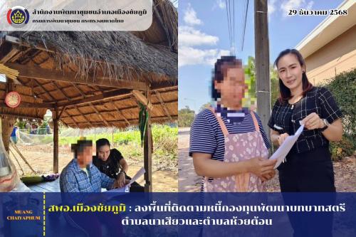 วันจันทร์ที่ 29 ธันวาคม 2568 นางอรอุมา รุจาคม พัฒนาการอำเภอเมืองชัยภูมิ มอบหมายให้ นางสาวรัชณี ฐานหมั่น นักวิชาการพัฒนาชุมชนปฏิบัติการ พัฒนากรประจำตำบลนาเสียวและตำบลห้วยต้อน ลงพื้นที่ติดตามหนี้กองทุนพัฒนาบทบาทสตรี อำเภอเมืองชัยภูมิ จังหวัดชัยภูมิ การลงพื้นที่ครั้งนี้มีวัตถุประสงค์เพื่อติดตามเร่งรัดการแก้ไขปัญหาหนี้ค้างชำระ ของกลุ่มลูกหนี้กองทุนพัฒนาบทบาทสตรี ให้คำแนะนำแนวทางการบริหารจัดการหนี้อย่างมีประสิทธิภาพ เสริมสร้างความเข้าใจเกี่ยวกับการชำระหนี้ เพื่อยกระดับการบริหารจัดการหนี้ของกองทุนฯ ในภาพรวมของจังหวัดชัยภูมิให้ประสิทธิภาพมากยิ่งขึ้น