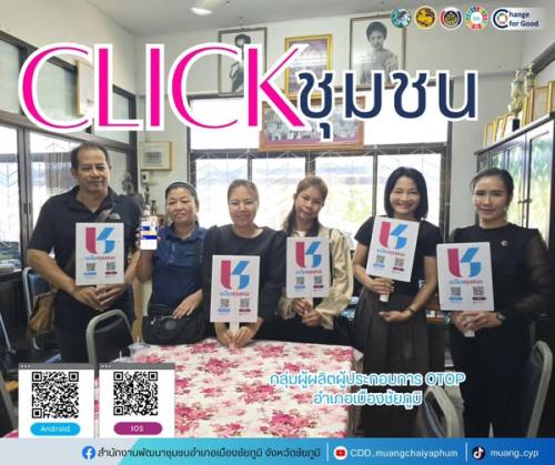 สำนักงานพัฒนาชุมชนอำเภอเมืองชัยภูมิ ประชาสัมพันธ์และส่งเสริมการดาวน์โหลดแอปพลิเคชัน Click ชุมชน และการสมัครและใช้บริการเมนู Shop ชุมชน ในแพลตฟอร์มบริการดิจิทัล Click ชุมชน ให้แก่ กลุ่มผู้ผลิตผู้ประกอบการ OTOP อำเภอเมืองชัยภูมิ
