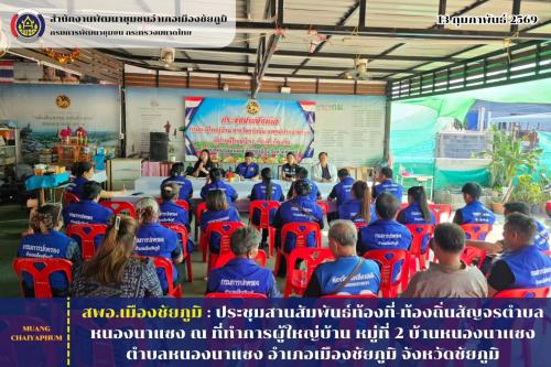 วันศุกร์ที่ 13 กุมภาพันธ์ 2569 เวลา 09.00 น. นางอรอุมา รุจาคม พัฒนาการอำเภอเมืองชัยภูมิ มอบหมายให้ นางสาวฐิตินันท์ สมัตถะ นักวิชาการพัฒนาชุมชนปฏิบัติการ (พัฒนากรประจำตำบลหนองนาแซง) เข้าร่วมการประชุมสานสัมพันธ์ผู้นำท้องถิ่น-ท้องที่ สัญจร ณ ที่ทำการผู้ใหญ่บ้าน หมู่ที่ 2 บ้านหนองนาเเซง ตำบลหนองนาแซง อำเภอเมืองชัยภูมิ จังหวัดชัยภูมิ ซึ่งจัดขึ้นเพื่อสร้างความเข้าใจในภารกิจของภาคราชการ เสริมสร้างความร่วมมือระหว่างหน่วยงานภาครัฐ ผู้นำชุมชน และองค์กรปกครองส่วนท้องถิ่น ตลอดจนขับเคลื่อนการพัฒนาพื้นที่อย่างมีประสิทธิภาพและยั่งยืน ในการประชุมดังกล่าว สำนักงานพัฒนาชุมชนอำเภอเมืองชัยภูมิ ได้ชี้แจงประเด็นข้อราชการที่สำคัญ ดังนี้