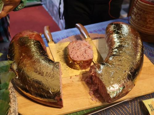 ผู้ว่าฯ ได้หั่นหม่ำยักษ์เคลือบทองคำ ทำจากเนื้อหมูคุณภาพดีด้วยสูตรโบราณ ให้ผู้มาร่วมงานได้ชิมรสชาติ หม่ำชัยภูมิ ที่เป็นเอกลักษณ์ พร้อมกล่าวถึงที่มาของ "หม่ำตำนานรัก" ว่าหม่ำไม่ใช่แค่การถนอมอาหาร แต่มันมีเรื่องเล่าจากอดีตที่พรานป่าต้องเข้าป่านานๆ จึงทำหม่ำเพื่อฝากเมียและลูกที่รออยู่บ้าน รสชาติของมันจึงแฝงไปด้วยความห่วงใยและความรัก เป็นของฝากอันล้ำค่าของชาวชัยภูมิที่ใครได้กินก็ต้องหลงรัก"