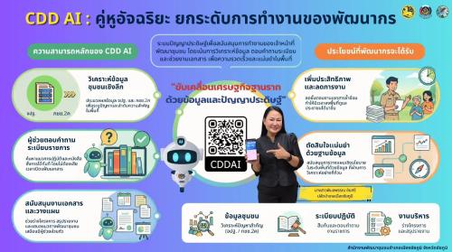 “CDD AI" เป็นระบบ ปัญญาประดิษฐ์ (AI) ที่ช่วยสนับสนุนงานของเจ้าหน้าที่พัฒนาชุมชน เน้นการ วิเคราะห์ข้อมูล ตอบคำถามระเบียบราชการ และช่วยงานเอกสาร ช่วยให้การทำงาน รวดเร็ว แม่นยำ และมีประสิทธิภาพมากขึ้น