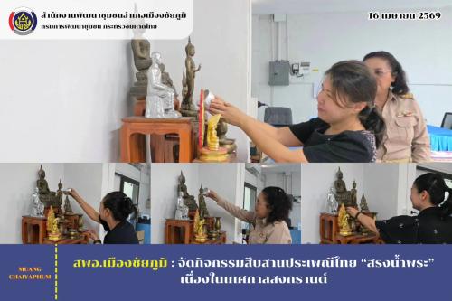 วันพฤหัสบดีที่ 16 เมษายน 2569 เวลา 09.00 น. ณ สำนักงานพัฒนาชุมชนอำเภอเมืองชัยภูมิ (ชั่วคราว) สำนักงานพัฒนาชุมชนอำเภอเมืองชัยภูมิ นำโดย นางอรอุมา รุจาคม พัฒนาการอำเภอเมืองชัยภูมิ พร้อมด้วยเจ้าหน้าที่พัฒนาชุมชนอำเภอเมืองชัยภูมิ ร่วมดำเนินกิจกรรมสืบสานประเพณีไทย “สรงน้ำพระ” เนื่องในเทศกาลสงกรานต์ เพื่อความเป็นสิริมงคลแก่ข้าราชการ เจ้าหน้าที่ และผู้มาติดต่อราชการ โดยมีบุคลากรในสังกัดเข้าร่วมกิจกรรมอย่างพร้อมเพรียง